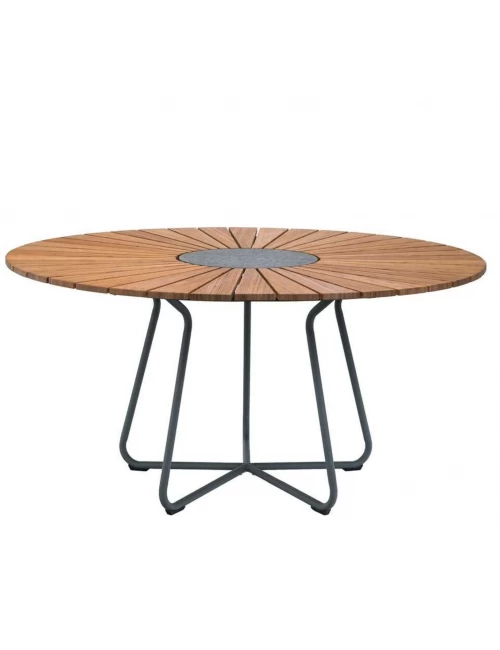 CIRCLE table of HOUE for outdoor use: Ø150 cm with table top lamels in bamboo and leg construction in gray powder coated aluminum. A beautiful and well proportioned dining table for your garden that enables free seating as the leg construction is drawn in under the table to provide comfortable legroom. 6 chairs around CIRCLE Ø150 is very nice, but the table easily seats 8-10 people when you have guests. Decorative granite stone in the table center for hot pots. The bamboo table top is pre-oiled.