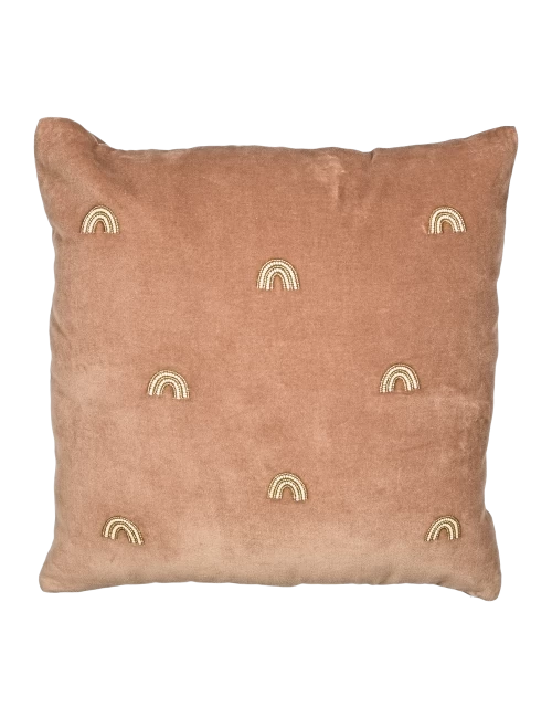 The little rainbowns on this marvellously soft velvet pillow will make you smile instantly. They are embroided by hand using gold thread and beads made of mother of pearl. In combination with its warm color it will give you that cozy feeling of long nights at home together with your loved ones. Choose one pillow as an eye catcher or pile them together with the other pillows from the collection to create an ultimate cozy nook.Â